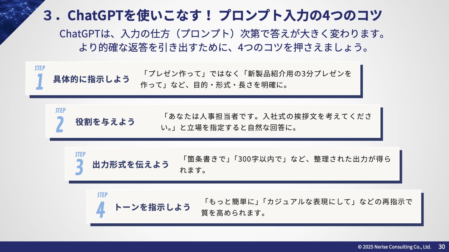 • 特に注目される「生成AI」の具体的な活用方法やプロンプトのコツを学ぶ。
