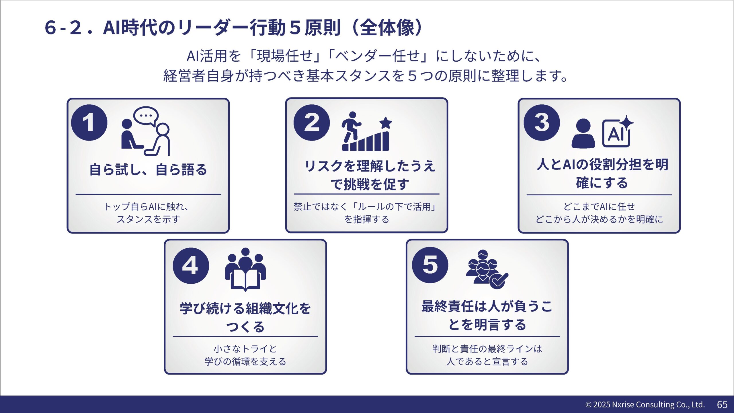 AI活用はもはや現場のツール導入ではなく、経営戦略そのものです。本研修では、経営者がAIの本質を理解し、適切な投資判断とリスク管理(ガバナンス)を行うためのリテラシーを養います。「AIをどこに適用し、どのような競争優位を築くか」を経営視点で議論し、実際にCopilotを触るハンズオンを通じて、自らの言葉でAI活用の方針を語れる状態を目指します。AI時代のリーダーシップと組織マネジメントを確立するための集中講座です。