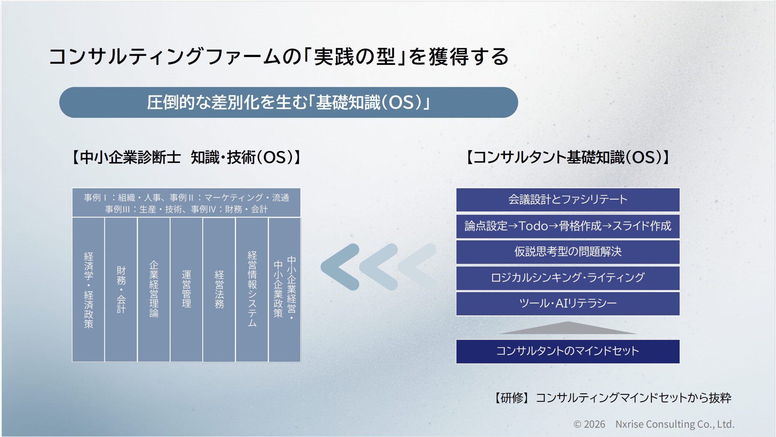 中小企業診断士として「年商500〜800万円の壁」を感じている方を対象に、公的業務や補助金依存から脱却し、コンサルティングファームの「実践の型(OS)」を身につけて高単価案件を獲得するノウハウを獲得する「“稼ぐ力”実践講座」です。本研修では、中小企業診断士が陥りがちなジレンマの構造を紐解くだけでなく、スキルの壁を突破する「実装型コンサル」の極意や、年商1,500万円を実現する事業ポートフォリオの考え方のエッセンスを3~4カ月の研修を通して習得いただきます。また、研修受講後は、弊社のコミュニティーに参加いただき、受講料を実案件で回収できる仕組みも準備しております。中小企業診断士資格を活かした自身の「勝ち筋」を見出したい方はぜひご参加ください