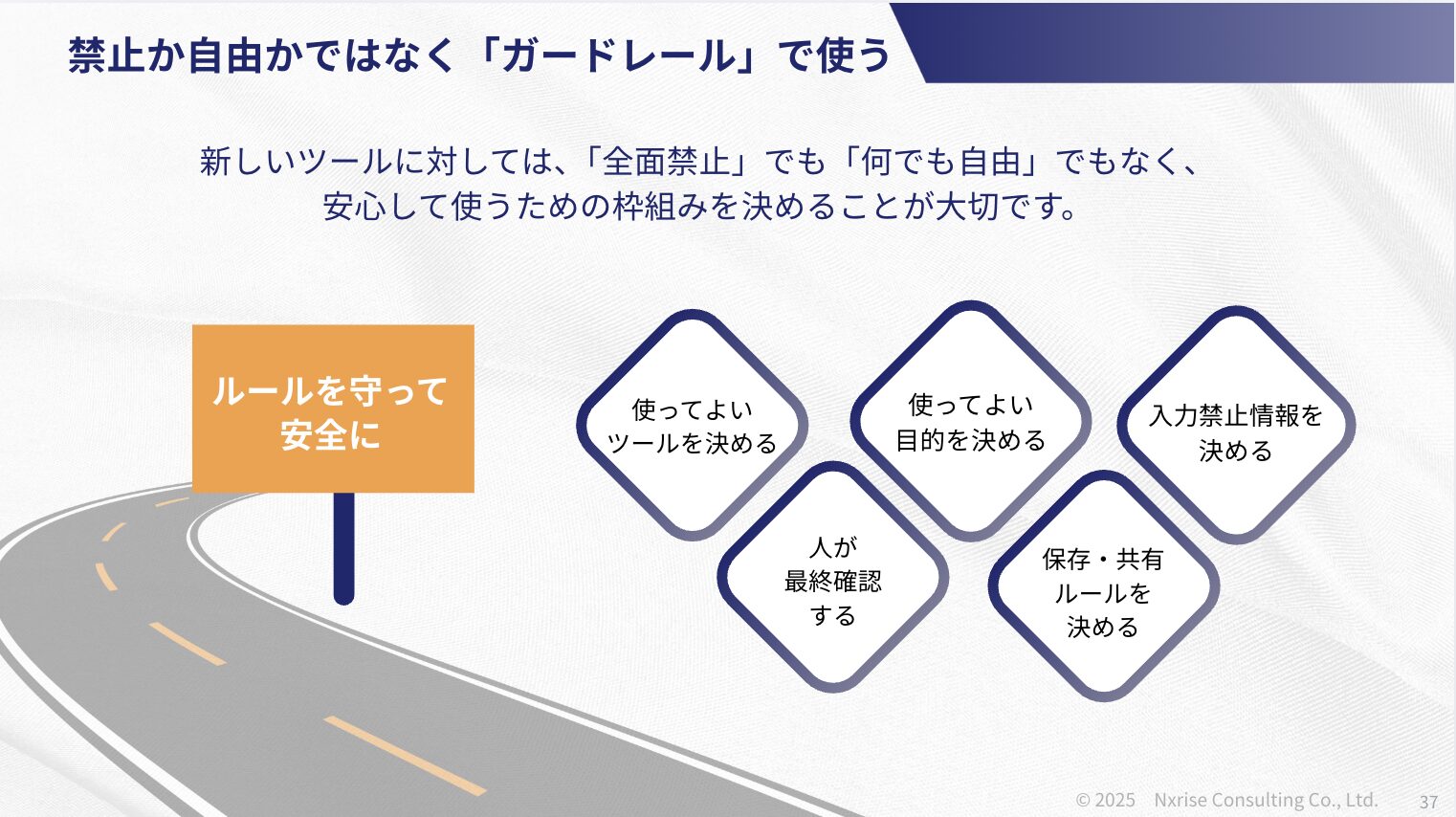 • 第4章:生成AIを含む新ツールの扱い方(入力してはいけない情報、ガードレールの設定と基本ルール)