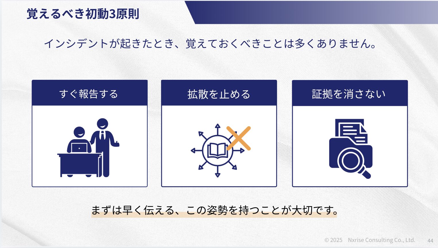• 第5章:インシデント発生時の初動(覚えるべき初動3原則、場面別の初動例と対応手順)