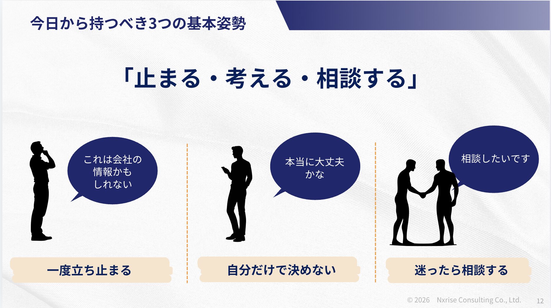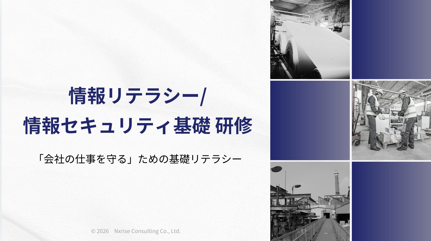 本研修は、情報セキュリティを「会社の仕事を守ること」と定義し、社員一人ひとりが当事者意識を持つための基礎リテラシーを習得するプログラムです。高度なサイバー攻撃への対策だけでなく、私用スマホの持ち込み、SNSへの何気ない投稿、移動中や休憩中の会話など、日常の行動の中に潜む情報漏えいリスクに焦点を当てています。特に、工場や拠点現場で発生しやすい「写真への写り込み」等の事例を交え、現場で迷った際の実践的な判断基準を学びます。また、生成AIツールの安全な使い方や、万が一インシデントが発生した際の初動対応も網羅しており、「迷ったら止まる・考える・相談する」という基本姿勢を組織に定着させます。
